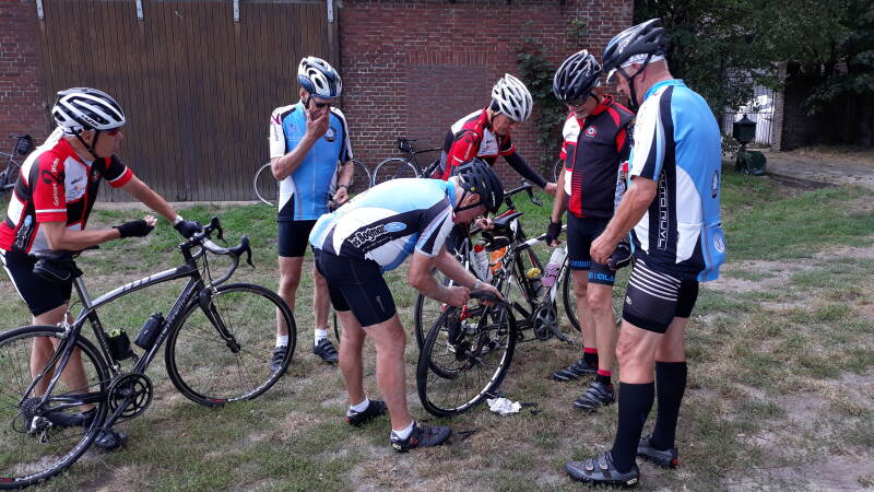 ” Dat zijn nu de meneren en mevrouwen van Opa’s fietsclub.” Dus toch een vroeg record wat aantallen betreft. Bijna de helft van het aantal leden. Hub koos voor een alternatieven rit in ons Heuvelland en Ben en Giel leidden de C-rijders via een eerder verkende route naar het Leudal. Verheugend dat Pierre, Toos en Mart na een lange, gedwongen afwezigheid weer aansloten. Verstandig dat zij in de buurt van Linne ons verlieten. Volgende keer weer wat verder meegaan en dan voelt het weer als vanouds. De andere twaalf, Ben, Giel, Erna, Tine, Jan, Chrit, Louwrens, Lei, Theo, Jean en de 2 Wimmen, reden in en straf tempo verder, waarbij de wind deze keer eens in het voordeel blies. Maar zo’n grote groep brengt ook extra problemen mee. Veel alerter rijden, letten op onverwachte manoeuvres, elkaar waarschuwen voor tegenliggers en ook respect hebben voor de kopmensen. Hen niet herhaaldelijk erop wijzen dat het te hard gaat of te snel wordt doorgetrokken na een bocht en zeker niet als je daarna hetzelfde handelt. Dan haken mensen af en dat mag nooit de bedoeling zijn. Niemand van ons wil een ander in de problemen brengen. Een ander gevaar van zo’n grote groep is het veilig oversteken. Probeer dat zoveel als mogelijk samen te doen. Zeker de eersten moeten daar op letten. Als zij nog over kunnen dan denken anderen dat het ook voor hen kan, maar dat is vaak niet zo. Beter een voetje aan de grond dan het geluid van een remmende auto. Laat veiligheid a.u.b. voorop staan. Beschouw dit stukje als bezorgdheid en laten we de veiligheidsregels waar ons Bestuur zo op hamert nog weer eens even aanscherpen. Zoals eerder aangehaald hadden Ben en Giel weer een verrassende aanloop uitgezocht. Nattenhoven, achterlangs Graetheide, Born, Baakhoven en parallel aan de A2 naar Echt. Brachterbeek en de Clauscentrale voerden ons naar Linne, waar de werkzaamheden aan de kapotte sluis ons even deden stoppen. Waren ze al weer een stuk verder gevorderd ? Voor ons niet direct waarneembaar. Wat volgde waren lange en brede wegen tussen de akkers van Baexem naar Neer, waar de hooggelegen en imponerende kerk al van ver te zien was. Wat een imposant gebouw voor zo’n kleine gemeenschap. Maar we konden niet lang stil staan hierbij, want even later moesten we flink aan de bak op de lange weg richting de pauzeplek. Een beetje vals plat, open en de wind pal op de neus. De beide kopmannen moesten flink in de pedalen, maar ook de anderen konden hun benen niet sparen. Maar ieders inspanning zou rijkelijk en vooral ook smakelijk beloond worden. Het in de volksmond “Café Goeden” genoemd liet geen plekje meer vrij toen wij het terras ‘bestormden’. In twee groepen konden we genieten van koffie, de alom geprezen bosvruchtenvlaai en cola of zelfs iets sterkers. Het was dik verdiend na bijna 60 km. Hier alles relaxed, i.t.t. bij onze Belgische buren. Ben, Tine en Jean verhaalden uitgebreid over hun ritje van zaterdag dat onder leiding van Hub uitgroeide tot een snelheidswedstrijd. Jean had daar nog zoveel adrenaline van dat hij op de terugweg het niet kon laten om een snelle fietser enkele kilometers te achtervolgen. Pas in Ohé en Laak kwam hij er achter dat hij contributie betaalde bij de TC Elsloo en dus voegde hij zich weer netjes bij ons. Dit even vreemd gaan zij hem vergeven. Niet onvermeld mag blijven het prachtige slingerweggetje direct na de pauze achterlangs De Spar, het bekende scoutingkamp, waar een van de rijders met zijn school op schoolverlaterskamp ging. Herinneringen kwamen boven, naast de namen van huisjes als Berenkuil, Vossehol, Bijenkorf, enz. Maar even verder werd die droom wreed verstoord door een lekke band van Giel, de tweede in korte tijd. Hoeveel pech kun je hebben. Eén groepje hield zich bezig met de reparatie, terwijl de anderen ervaringen uitwisselden over het soms schurende onderwerp: De Zeem in de Fietsbroek. Hoe serieus ook, maar er werd toch ook hevig gelachen toen allerlei hulpmiddeltjes ter sprake kwamen, tot smeermiddeltjes aan toe. Wat nu de algemene conclusie was bleef in nevelen gehuld, want Giel en zijn hulpjes stonden weer klaar om de weg te vervolgen. Misschien een verdere sessie tijdens de volgende rit, maar dan geen aanleiding na een lekke band. Via Fun Beach in Panheel werd koers gezet naar de brug in Wessem en Maasbracht om na het uitstapje van Jean de dijk van de Maas weer op te zoeken. Meestal rijdend als eenden achter elkaar, i.v.m de drukte. Als je niet beter wist dacht je met twee in elkaar geschoven groepen van doen te hebben. Een blauwe brigade en de rood/zwarte fietsers en ook één vreemde eend in de bijt. Bij Urmond splitste de groep zich in tweeën, eentje onderlangs en de anderen bovenlangs. Zo kwam er na bijna 110 km een einde aan deze altijd mooie rit. Wij kijken al weer uit naar de echte Memorialrit in september, maar verheugen ons ook elke keer weer op de routes die Ben en Giel voor ons in petto hebben. Bedankt iedereen en op naar de volgende mooie en veilige rit.