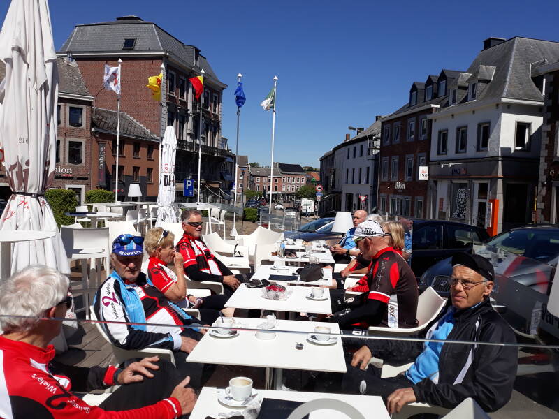 vandaag 15 mei, op weg naar Aubel, wind 4 uit NO, zonnig maar niet meer dan 16 graden. Een heel peloton aan de start: Ben, Jan , Guus, Bert, Wim, Wim, Toos, Tine, Erna, Lei, Chrit en Louwrens. Op weg naar Aubel via de standaard route via Warsage.. De weg van Val dieu naar Aubel was picobello verzorgd, nieuw asfalt, lekker om op te fietsen. Met zo'n groep van 12 heb je altijd veel koptrekkers, was heel gemakkelijk deze keer. De wind was op de terugweg best stevig. In Aubel gepauzeerd in ons stamcafe, althans op het terra van het café. Zeer blauwe lucht vandaag. Op de terugweg goed gekeken of de groep telkens compleet was, petje af iedereen. Met 12 man fietsen is toch een uitdaging. Op tijd bij de dikke Stein gearriveerd voor de evaluatie en de nieuwste roddels.