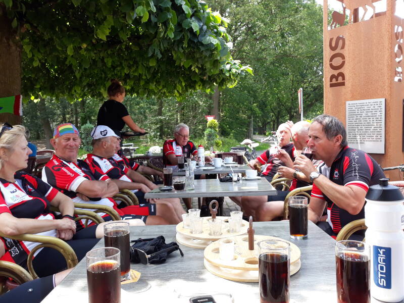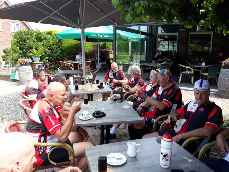De ruimte die gereserveerd is voor het thema van een ritverslag is soms te weinig om daar een pakkende titel voor te maken. Het zou meer recht doen aan deze Memorialtocht als daar de toevoeging “ een hartverwarmende rit “ bijgeschreven kon worden. Maar daarover straks meer. Eerst maar eens ingaan op de genoemde titel. Een keer per jaar is het een goede en prijzenswaardige traditie om onze overleden leden middels een tocht naar Roggel nog eens extra te gedenken. Omdat zij uit alle geledingen van onze club komen is dit de enige gelegenheid waarbij wij ook gezamenlijk als TC Elsloo op pad kunnen gaan. En dan is er geen onderscheid in niveaus, worden tempo’s aangepast, krijg je indien nodig een duwtje in de rug, worden de kopmannen even tot kalmte gemaand als zij te enthousiast met de snelheid spelen, fietsen de sterken voorop tegen de wind in, kortom is er zorg voor elkaar. Daarom zou de toevoeging moeten zijn: “ een hartverwarmende rit !” Een pluim op de helm dus voor Louwrens, Frans P en Frans T, Ruud, Wim, Giel, Theo, George, Erna, Sjraar, Martin, Chrit, Ger M en een wat grotere pluim voor routeleider Ben. Hij leidde ons met niet al te veel omwegen naar het zonovergoten terras van Café Dennenoord in Roggel. Gelukkig kenden de voorspelde regen- en onweersbuien onze route niet en konden regenjasjes en eventuele oordopjes tegen het gedonder weer ongebruikt naar Elsloo terug fietsen. Zelfs de pikzwarte wolken die bijna de kerktoren van Kessenich omarmden, lieten ons ongemoeid passeren. En waar diezelfde wolken zich ontdaan hadden van hun regenlading, hoefden wij niet bang te zijn dat de dunne racebandjes aan het warme asfalt bleven plakken. Ook waren die blij dat ze, zonder lek te raken over een kilometerslange grindweg door de bossen van Heythuysen, eindelijk het betonnen fietspad naar Roggel konden opdraaien om na 52 km rust te krijgen op het terras. En sinds de knie van onze Tom weten wij precies wat voor schade zelfs één stukje grind kan teweeg brengen. In Roggel had Ben ons al de dag van te voren aangekondigd en wist de eigenaresse dat ze met een hongerige groep fietsers uit Elsloo te maken kreeg. En dat betekende dat er misschien wel zes of zeven soorten vlaai voor het uitkiezen waren. Maar de veteranen onder ons wisten dat je hier naar toe moest komen voor de onvolprezen bosvruchtenvlaai met slagroom. Toen die dan ook door de meesten besteld werd kwam al gauw de gedachte op: “Zouden ze wel genoeg hebben en worden de stukjes wat kleiner?” Maar niks daarvan, ze waren groot genoeg om zonder problemen de lange weg terug te rijden, zelfs een extra rondje had ook nog gekund. Er zat energie genoeg in. De penningmeester had vanuit zijn vakantieadres toestemming gegeven aan Louwrens om vlaai en twee consumpties op rekening van de Toerclub te zetten. Bedankt Harrie ! En de mensen van de Kascontrole zijn nu ook al op de hoogte van deze uitgave. Behalve deze smakelijke mededeling hield Louwrens ons nog op de hoogte van een aantal ontwikkelingen / activiteiten van onze club. Uiteraard stond hij stil bij de leden die ons nog niet zo lang geleden ontvallen waren. Daarna de collega’s die even in de remmen moeten knijpen vanwege lichamelijke ongemakken. Dat hoeft niet verbazend te zijn met een gemiddelde leeftijd van 67 jaar. Daarom denkt het Bestuur er serieus over om een nieuwe groep toe te voegen, de E-bikers. Dit moet echter nog verder uitgewerkt worden. Of om in die stijl te blijven. De accu is er, nu moet die nog helemaal opgeladen worden. Voor de Driedaagse in de regio Geldern/Kevelaer zijn de minimale zes aanmeldingen binnen. Waarschijnlijk gaat dit terug naar vijf. Desondanks krijgt dit initiatief de toestemming van het Bestuur om er verder gestalte aan te geven. Voor de Familiedag op 15 september is het bedrijf van George Brouwers in Schimmert het middelpunt. Nadere details volgen nog. Omdat de weersvooruitzichten na de middag onzeker waren werd besloten om de kortste weg richting Elsloo te nemen. Waar de rijders van de C-groep vóór de pauze het initiatief hadden, zo werden zij nu afgelost door de B-mensen omdat de wind in het nadeel blies. Een gewaardeerde samenwerking. En de A -rijders ? Zij bleven achterin om iemand die het even moeilijk had weer naar voren te loodsen en daarbij schroomden ze niet om even een duwtje extra te geven. En omdat er geen jury in de buurt was werd dit niet bestraft. Integendeel, bedankt mannen. En zij bezorgden netjes Erna’s bidon terug die bij een knobbel in de weg de vrijheid nam de houder te verlaten. Nu we het toch over bidons hebben. Als je met een volle bidon op weg gaat en er na een drietal kilometers achter komt dat die al voor een kwart leeg is zonder gedronken te hebben moet je eens kijken of je hem wel goed dicht gemaakt hebt. De spetters op je benen zijn dus niet van de regen, maar van de bidoninhoud. Uiteraard noemen we geen namen, maar zeggen wel dat hij iets met dit verslag te maken heeft. De route die wij gereden hebben kunnen jullie zien via de bijgevoegde link. Tevens als herinnering een aantal foto’s. Samen met dit stukje is het hopelijk een mooi en blijvend aandenken aan onze jaarlijkse Memorialtocht, voor de deelnemers en tevens voor hen die niet aanwezig konden zijn. Het waren een hartverwarmende 105 km die met een gemiddelde van ruim 23 werden afgelegd.